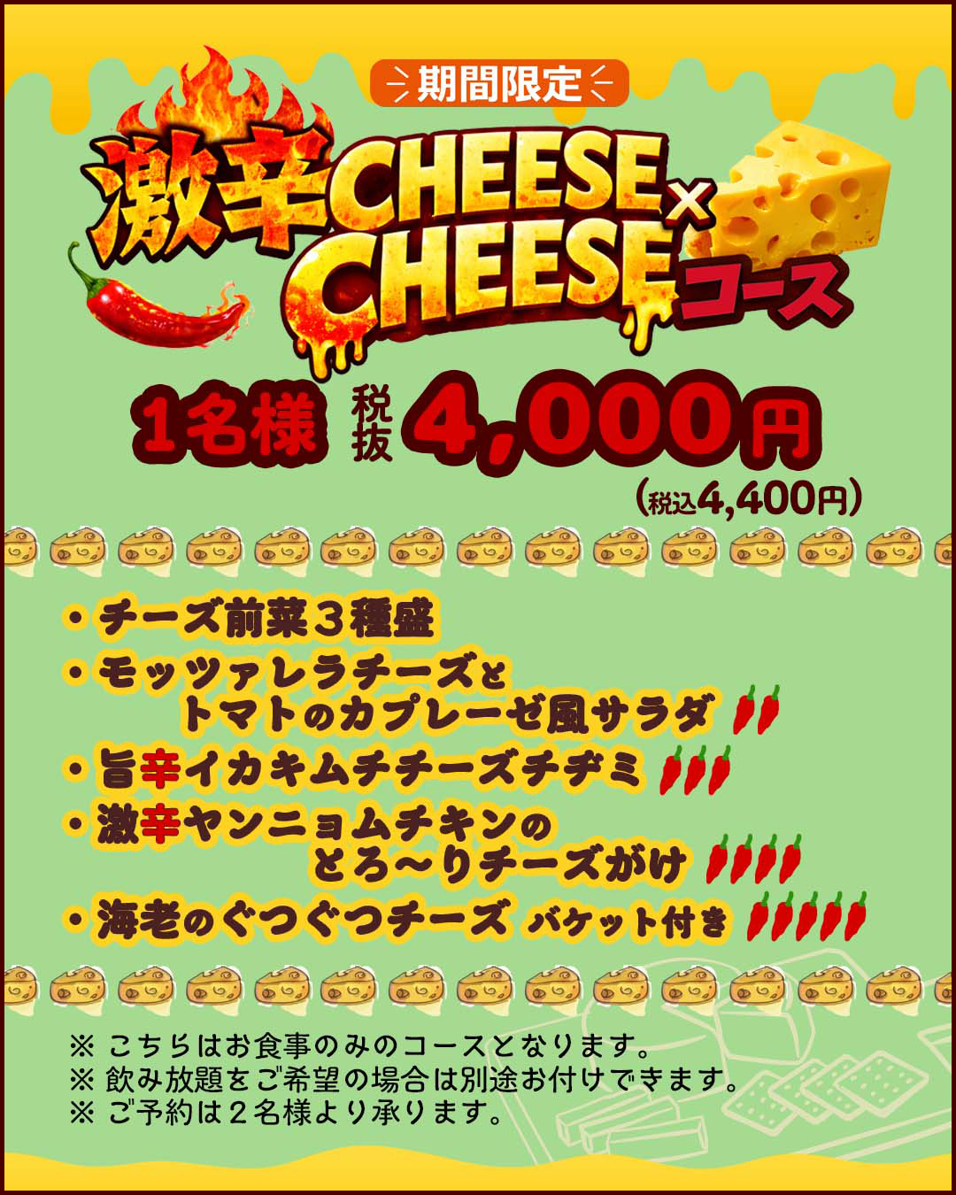 760円~旨辛チーズチヂミ、特薦海鮮野菜チヂミ、キムチチーズチヂミなど